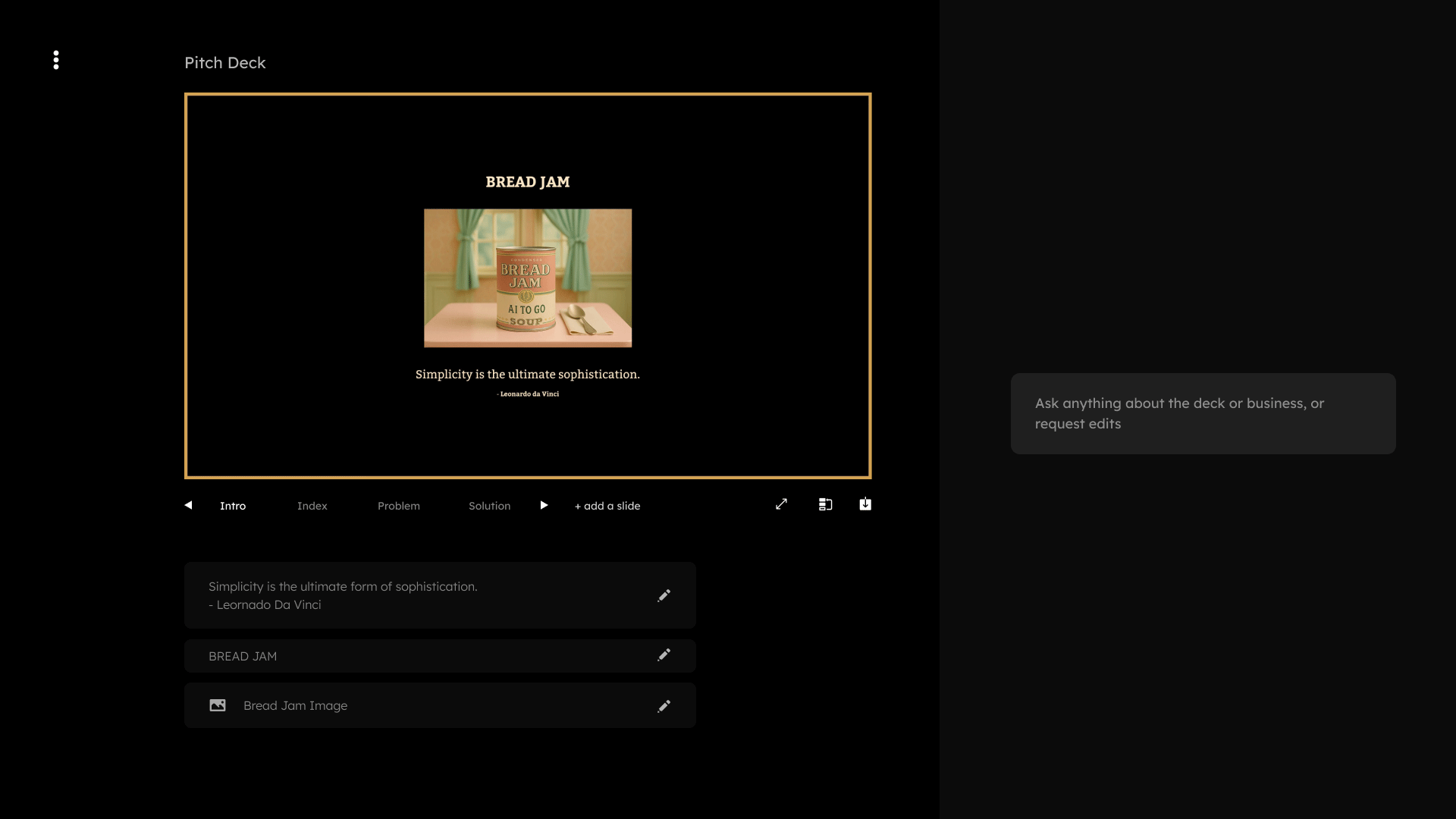 Information Overload: Entrepreneurs struggle with organizing scattered thoughts into coherent narratives. This co-pilot streamlines this to three fundamental questions: Why? What? How? Users input brief or detailed responses, and receive a complete, editable deck immediately.